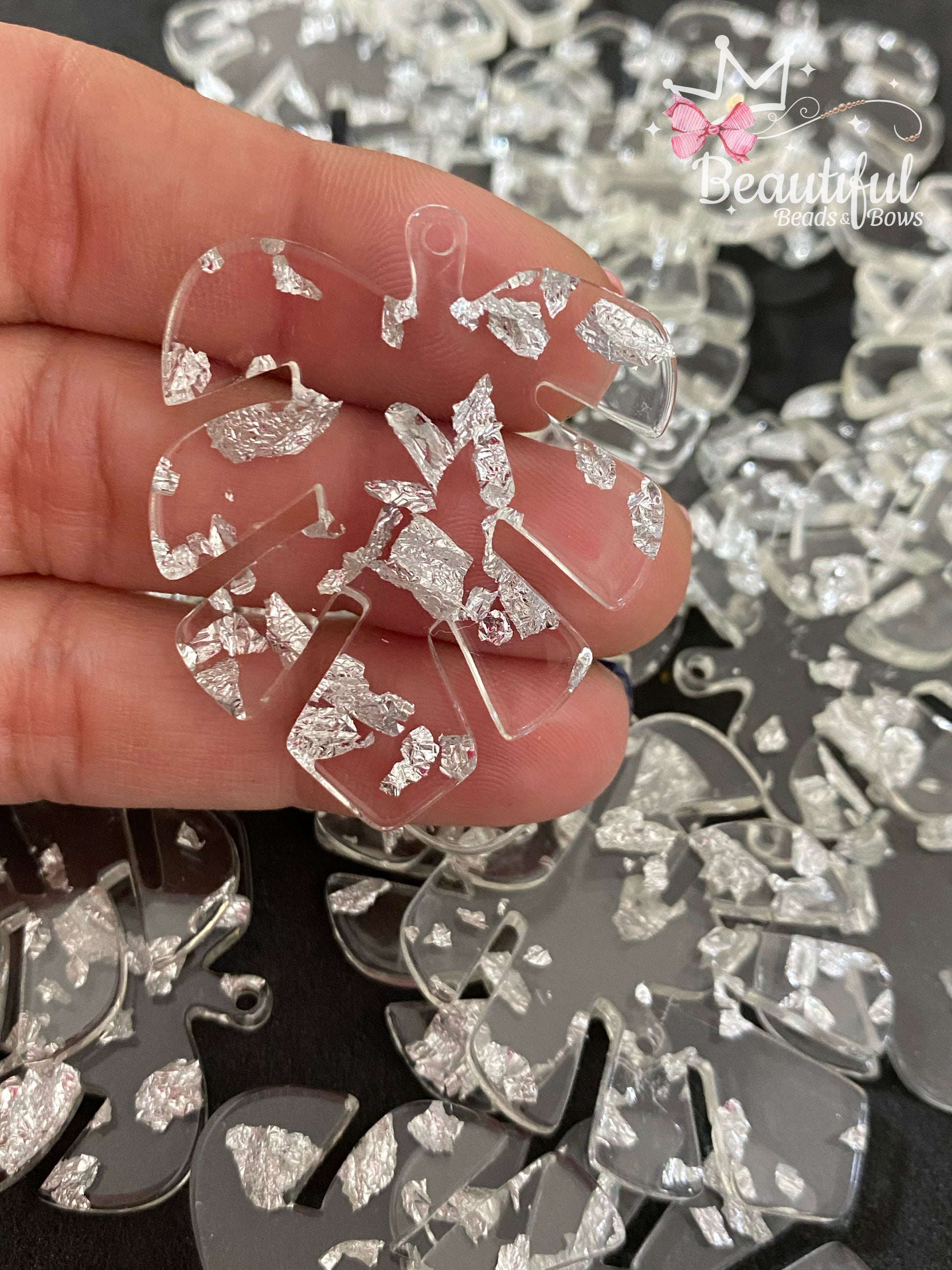 Dije forma de hoja monstera en resina aprox. 2"plg color clear y silver.