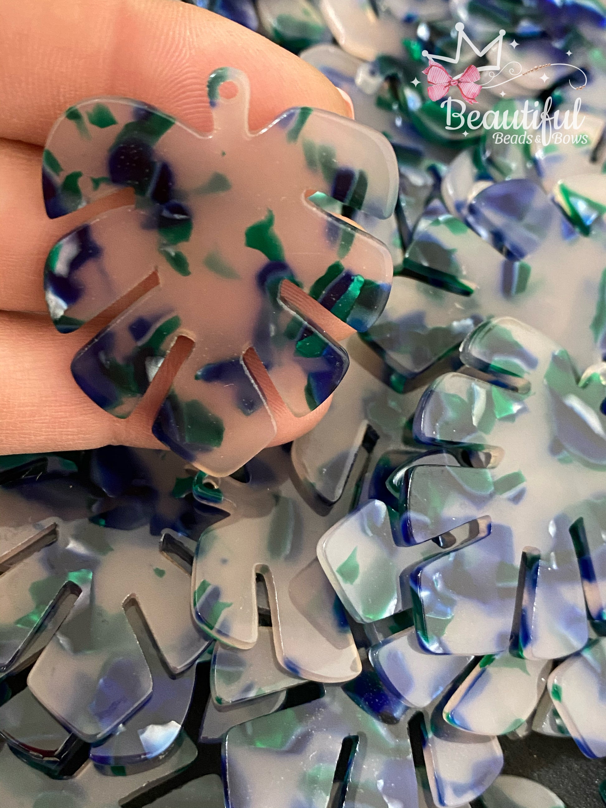 Dije forma de hoja monstera en resina aprox. 2"plg color green and blue spot.
