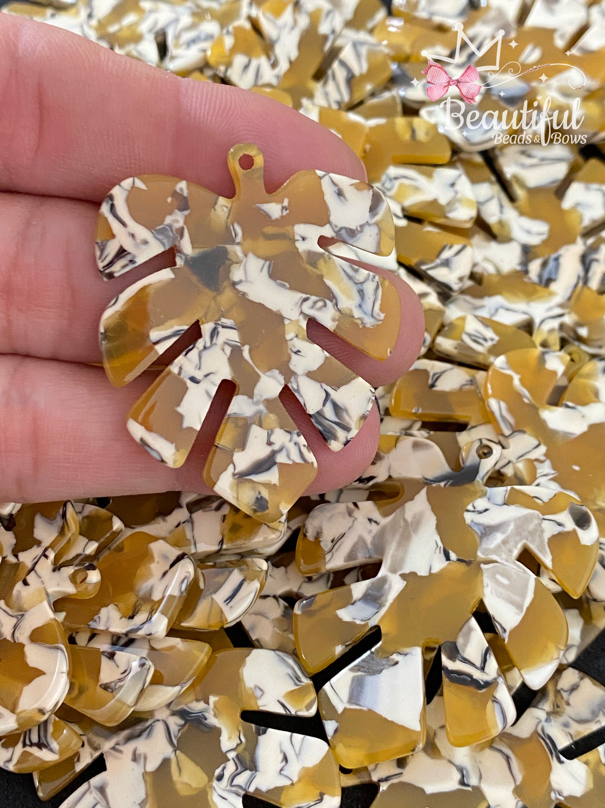 Dije forma de hoja monstera en resina aprox. 2"plg color mostaza.